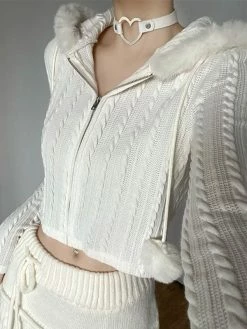 Emmiol Cropped Fuzzy Trim Cable Knit Hooded Cardigan