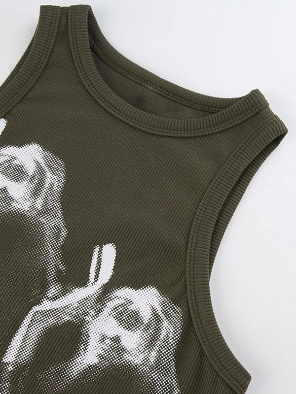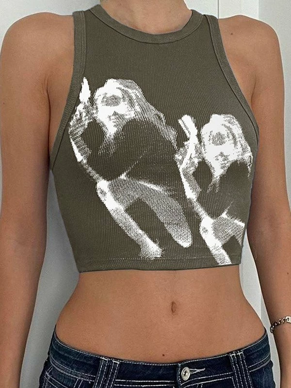 Description: Crafted from stretchy rib knit fabric, these cute tops shaped to a crop length and racer back detailing, with abstract graffiti pattern print design.