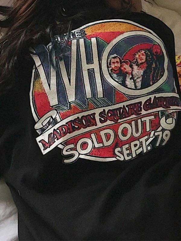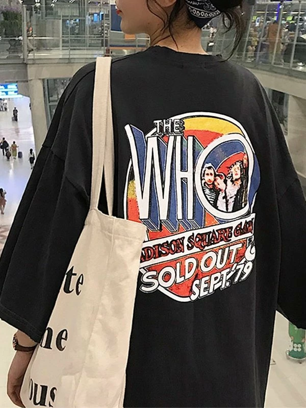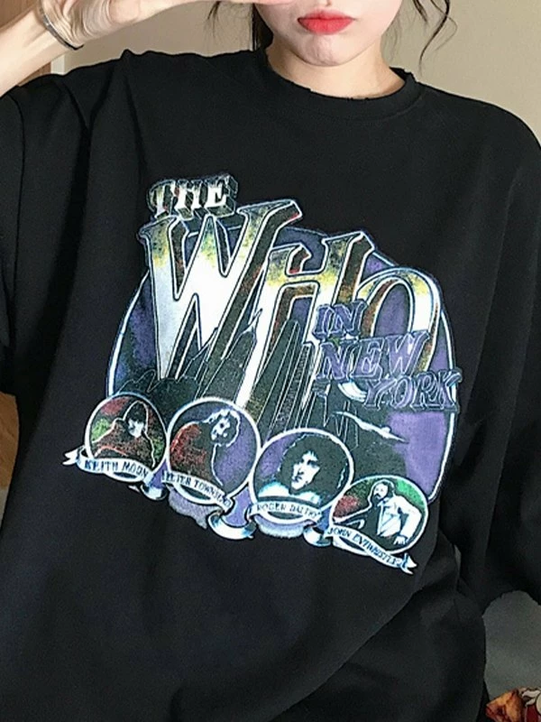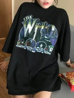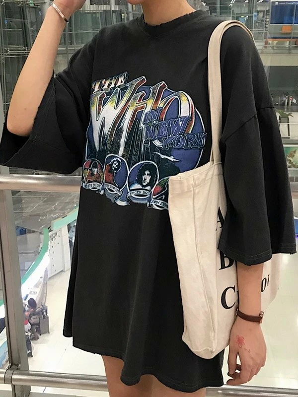 Description: Cuts to a longline silhouette, features dropped arms, and a design of rock band graphic at front & back.