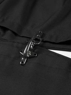 Description: Inspired by a buckle belted waist, features cutout leg embellished with metal hooks on it, with functional pockets and has pleated seam detail.
