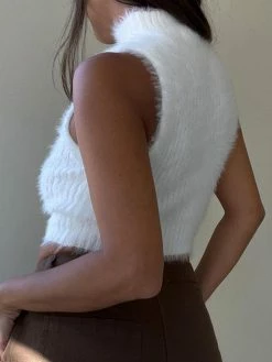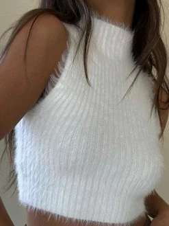 Emmiol High Neck Fuzzy Knit Cropped Tank Top