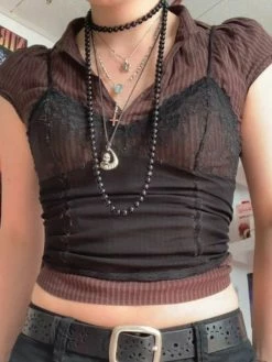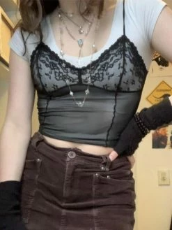 Description: These must-have versatile cute tops made from sheer mesh fabric, shaped to a super crop length, features ultra-thin shoulder straps, with lace paneled at chest, we’re obsessed.