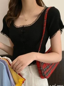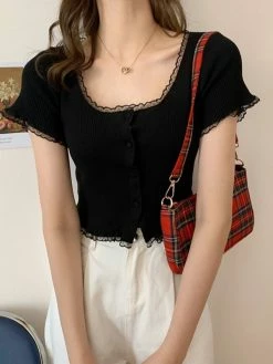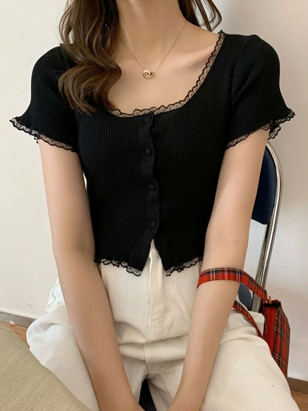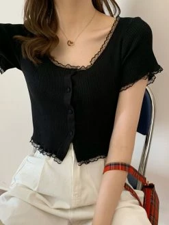 Be the first to review “Emmiol Lace Trim Short Sleeve Button Knit Top” Cancel reply