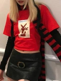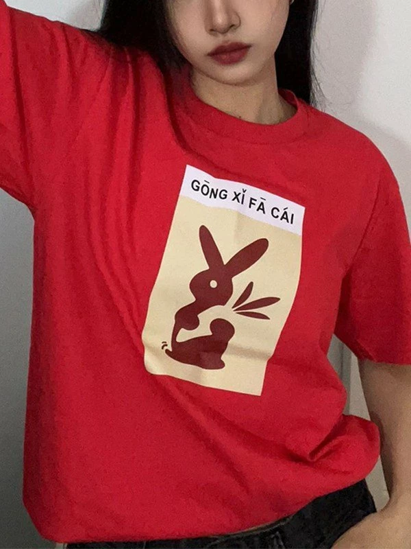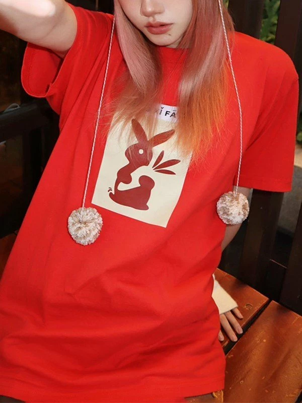 Description: New year new tees, take this bright colored tee to start your year 2023. It’s made from pure cotton fabric, features a longline silhouette, and a design of cartoon rabbit with carrot printed on it.