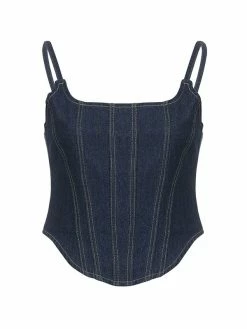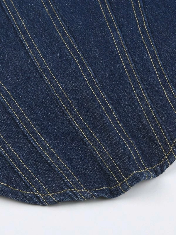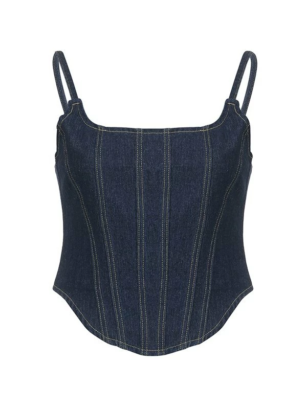 Description: Make yourself a 90s vintage vibe with this denim corset. It has paneled stitch seam design along the body, features an open back, and an exposed zip closure at back.