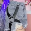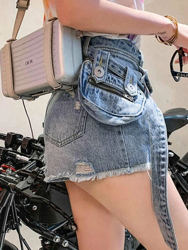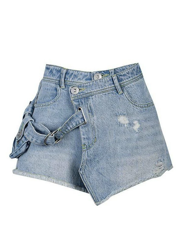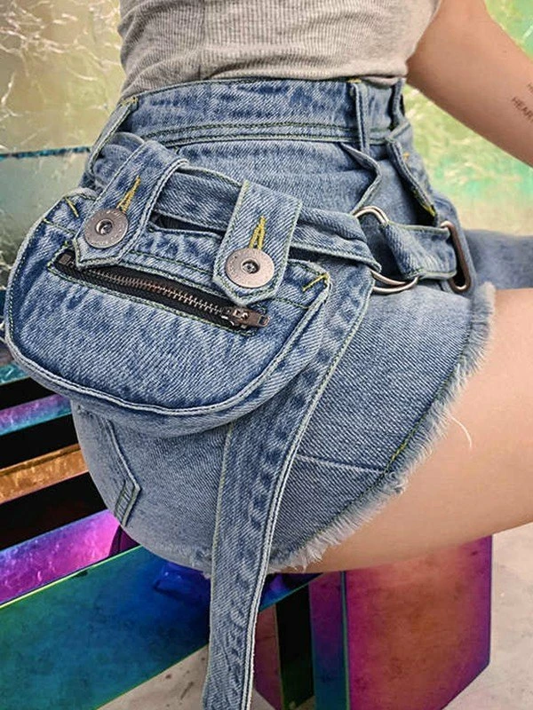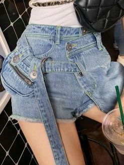 Description: Love the pocket detail on these shorts. These denim shorts shaped to a straight-leg silhouette, it has a detachable fanny pocket, features a cross over waist, frayed rips design, with functional pockets, raw cut hem and metal button zip detailing.