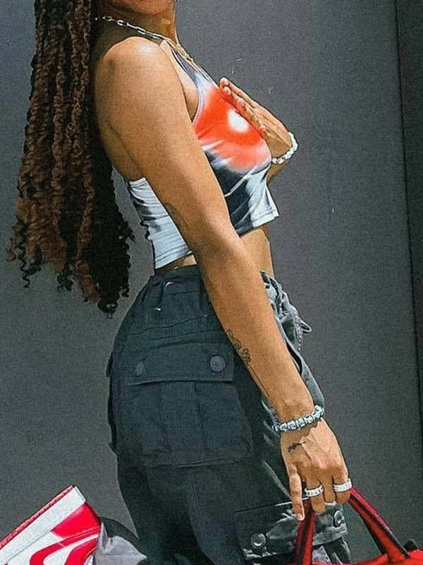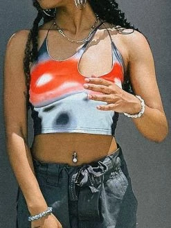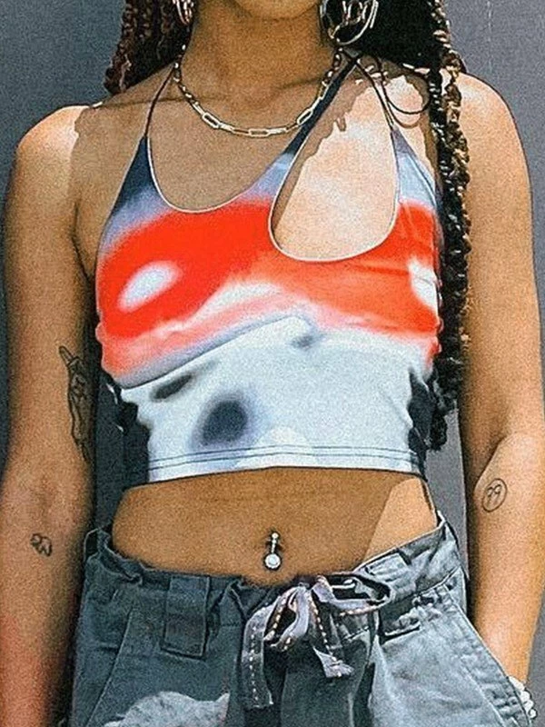 Description: Such chill cool-girl cami top for street outfits. This cami top has a halter neck style with an irregular shoulder strap design, features tie-dye abstract print, and with adjustable tie fasten on the back.