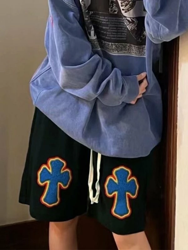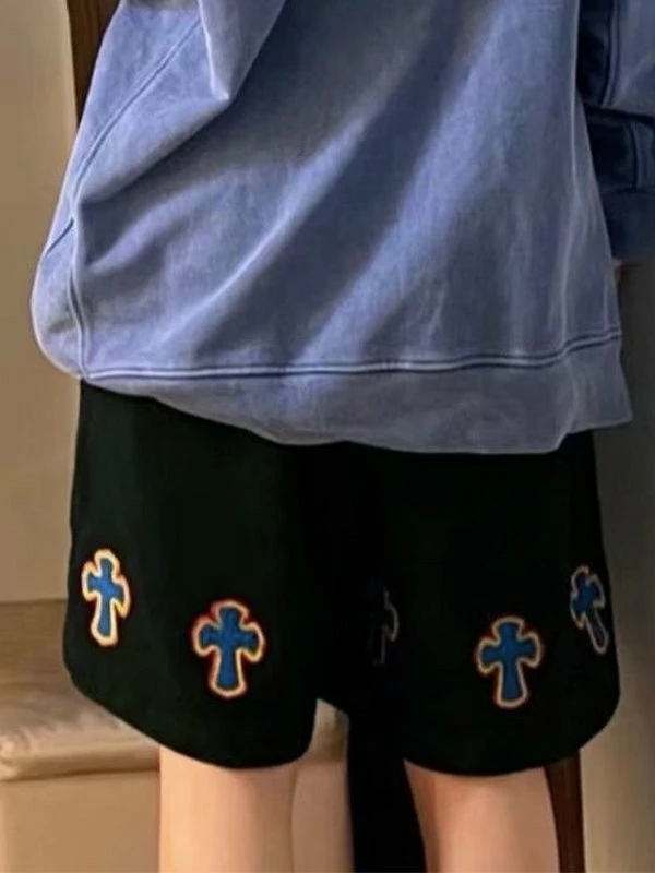 Description: These sweat shorts have an adjustable tie waist, features toweling cross embroidered at front & back.