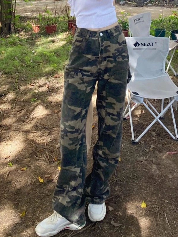 Description: These retro cargo pants shaped to a fitted straight-leg silhouette, inspired by camo pattern print allover, features patched detail to the leg, with 5 pockets styling and has a button zip fly.